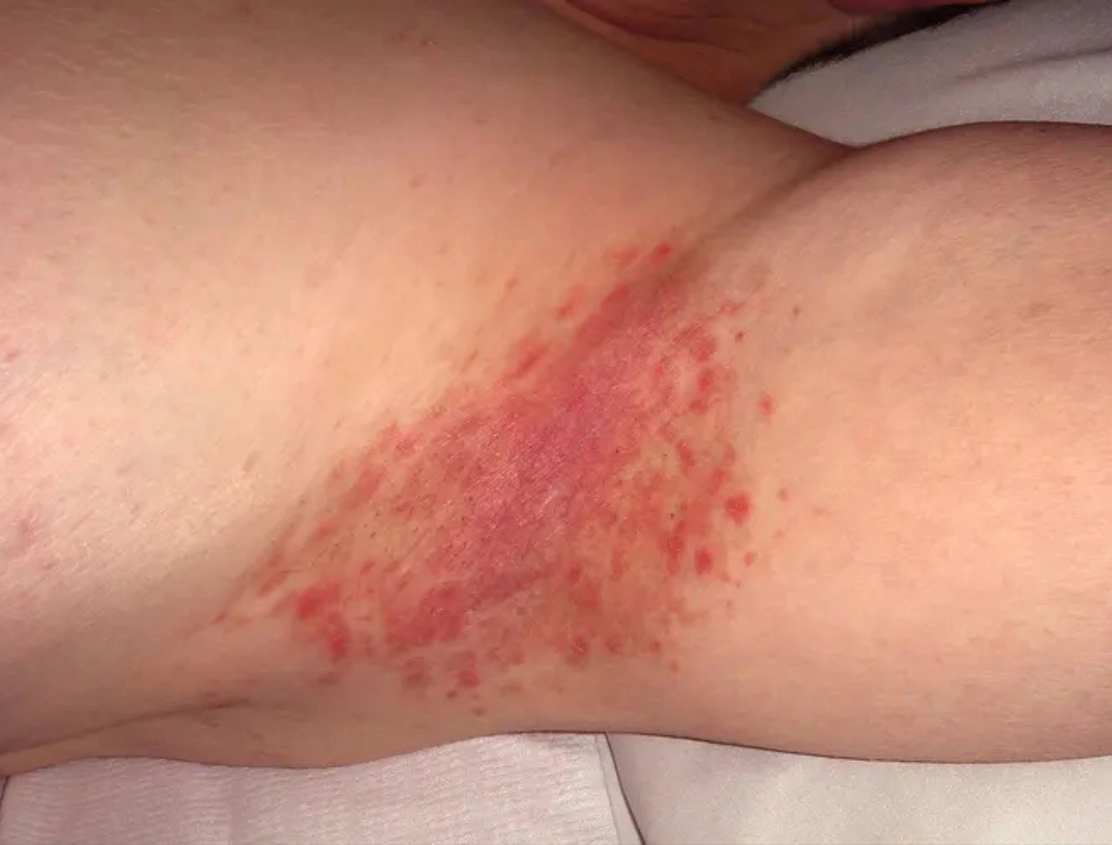red, smooth patches in folds (underarms, groin)