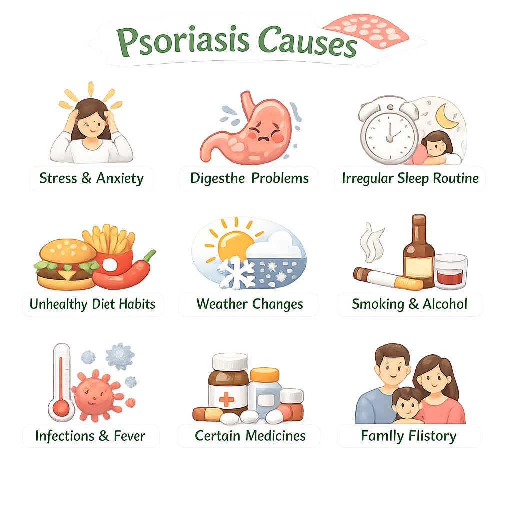 Psoriasis doesnβt have one single cause. It is often triggered when internal imbalances combine with external factors. Common triggers include: